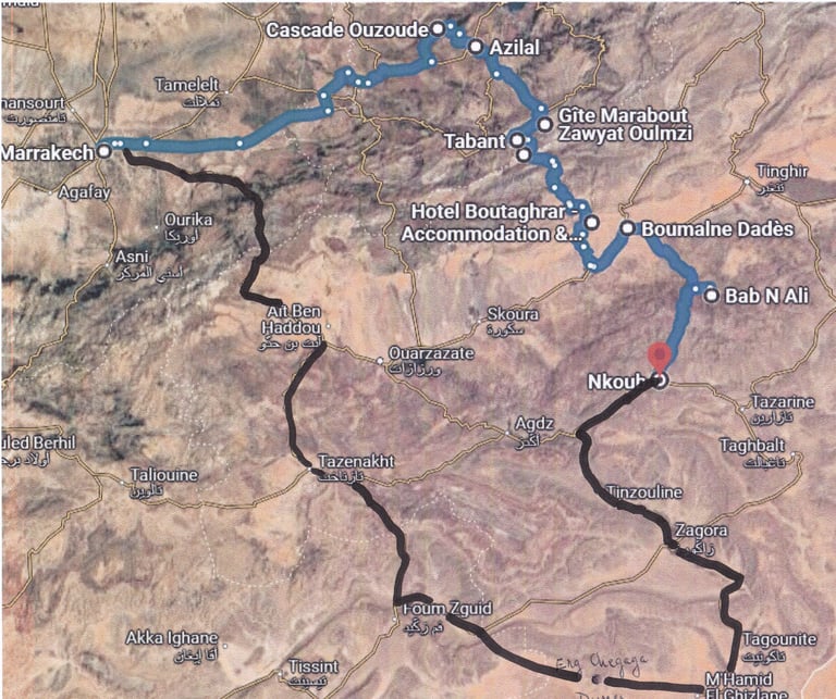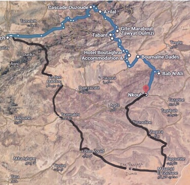 Jour : 2 : départ 4x4 via Demnate, visite des cascades d'Ouzoud 1 h30 de marche. Déjeuner. Puis en 4x4 traversée Azilal puis nuit au gîte Marabout au fond de la vallée heureuse 2125 m. 5 à 6 heures de voyage 260 km.